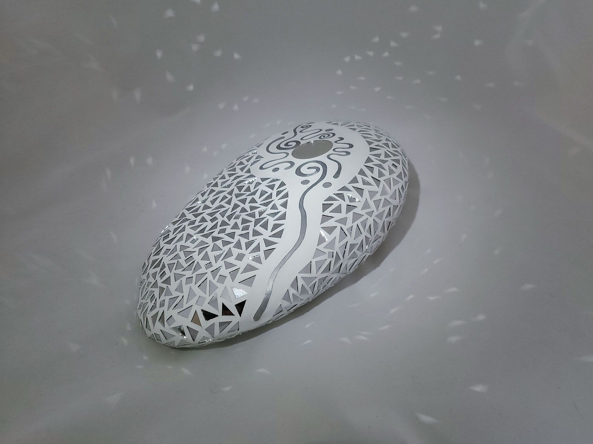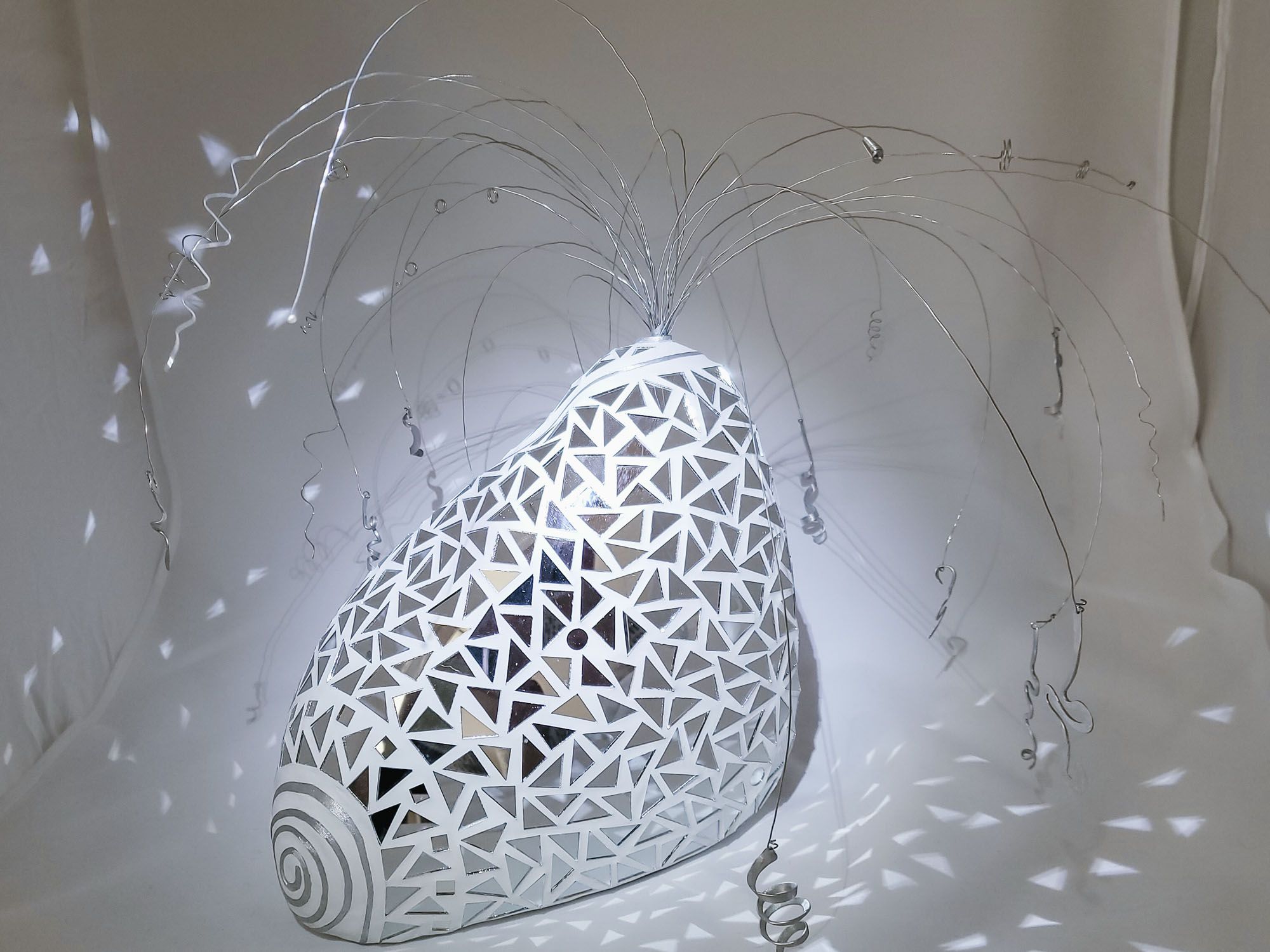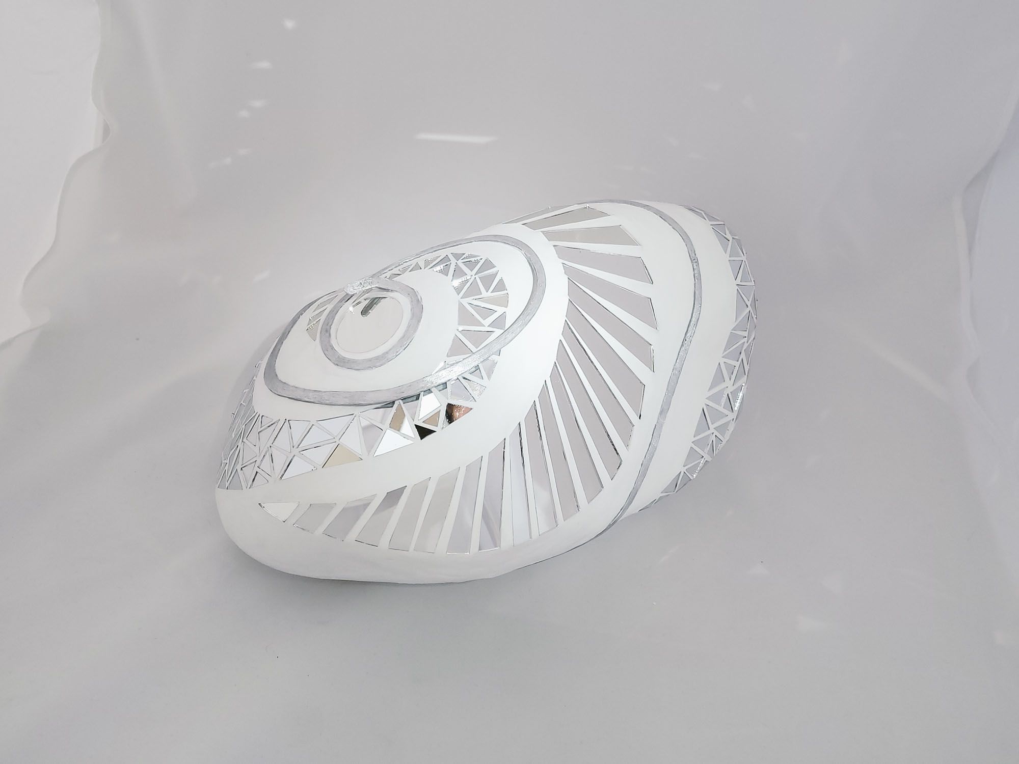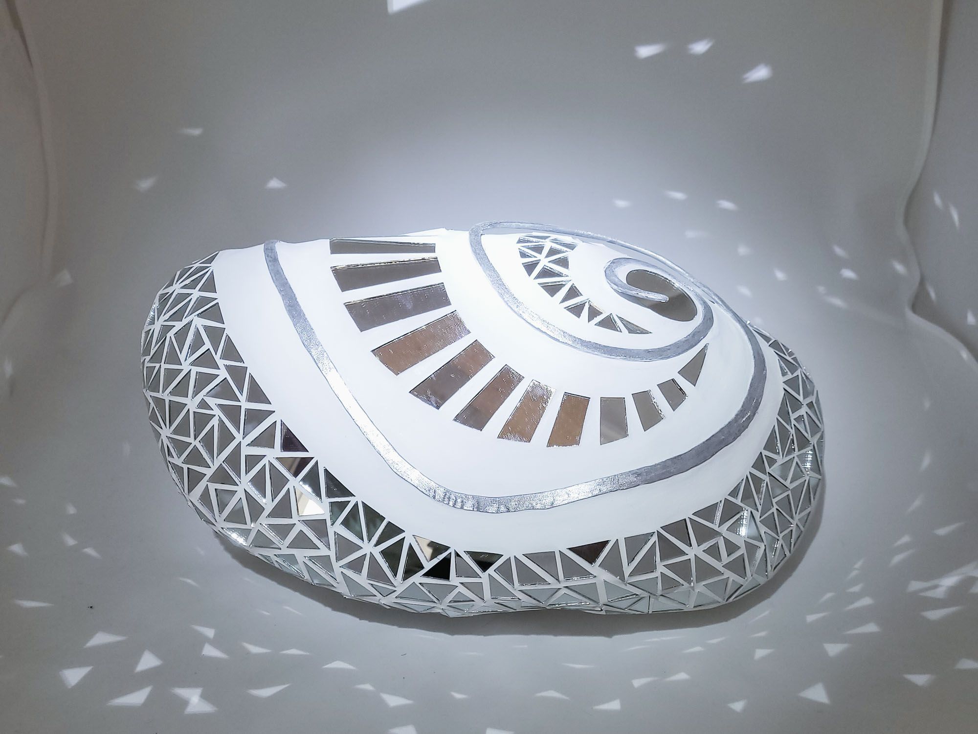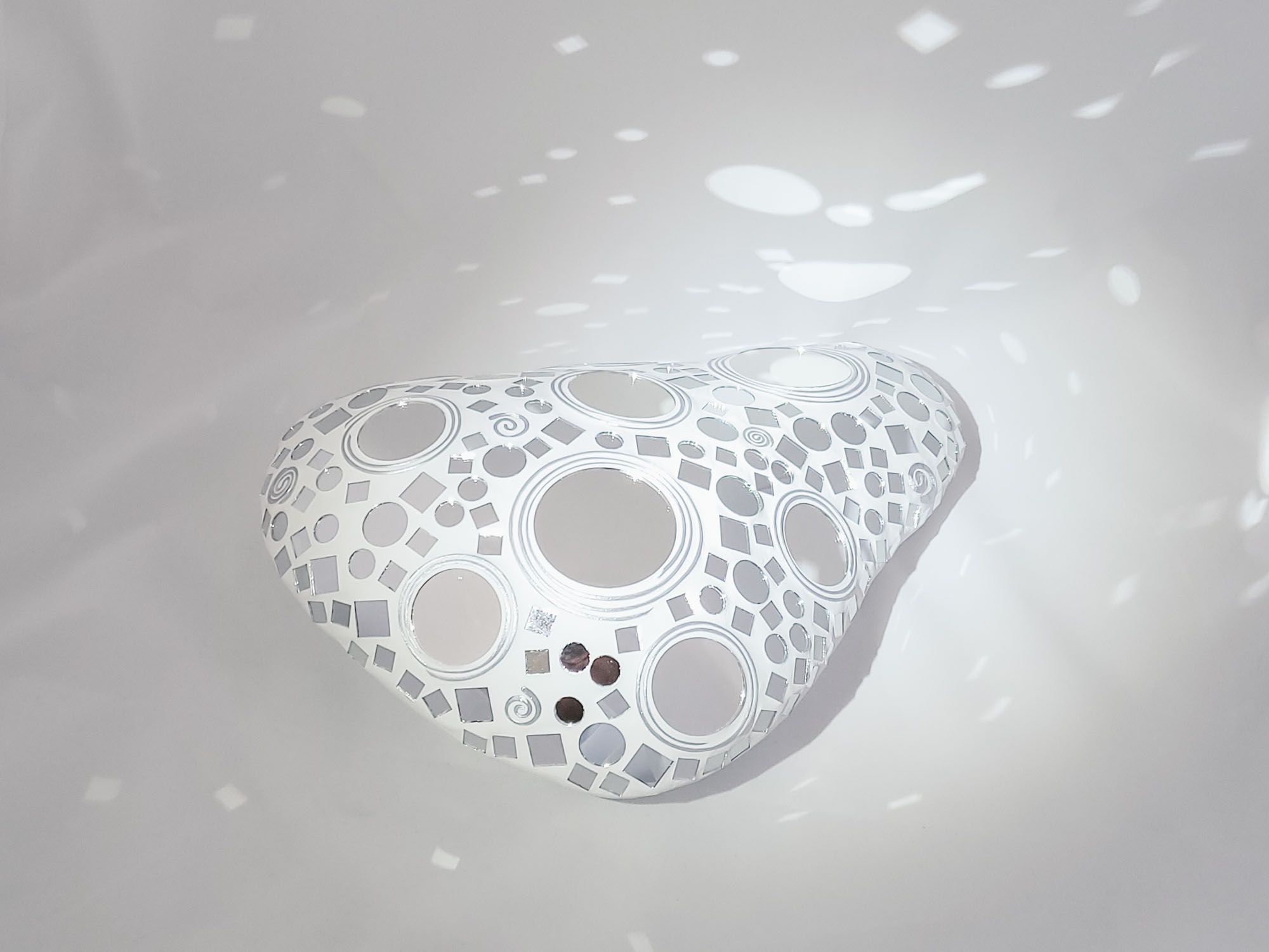 Die lichte Leichtigkeit der Steine: Für ihre Spiegelsteine verbindet ursamoh gegensätzliche Materialien und verarbeitet sie zu einem dreidimensionalen, glitzernden Ganzen. Basis für ihre harmonischen Werke sind bis zu 20 Kilo schwere Steine. Diese findet sie am Ufer oder im Wasser von Flüssen und Bächen. Die Steine überzieht sie in akribischer Kleinarbeit mit plattgeklopftem, geschwungenem Aluminiumdraht, Fugenzement und Glasnuggets. Damit verbunden ist ein ebenso intensiver wie spielerischer Dialog mit der Form und Dynamik jedes einzelnen Steins. Aus dieser Auseinandersetzung erschafft ursamoh lichterfüllte Unikate voller Energie.