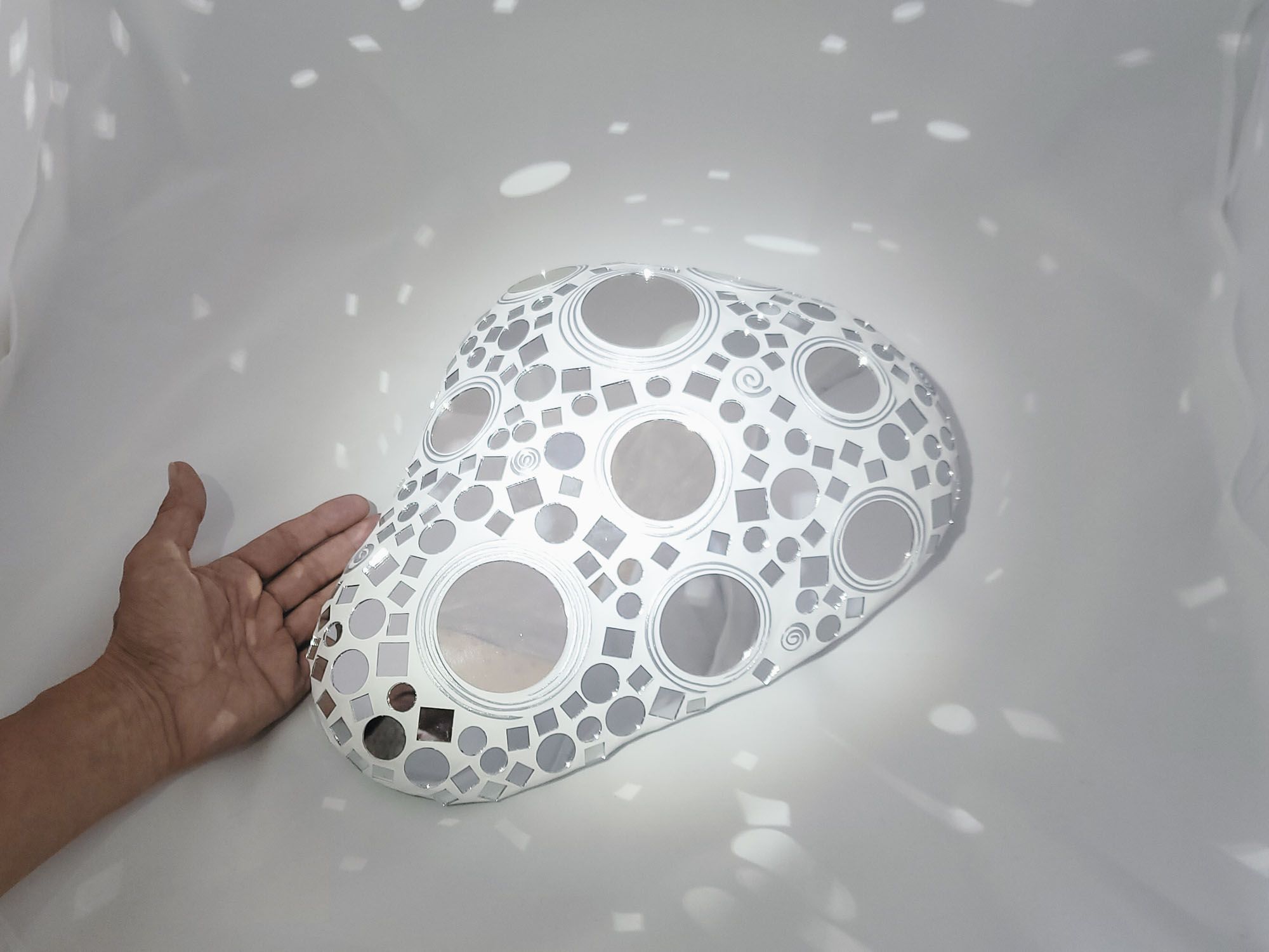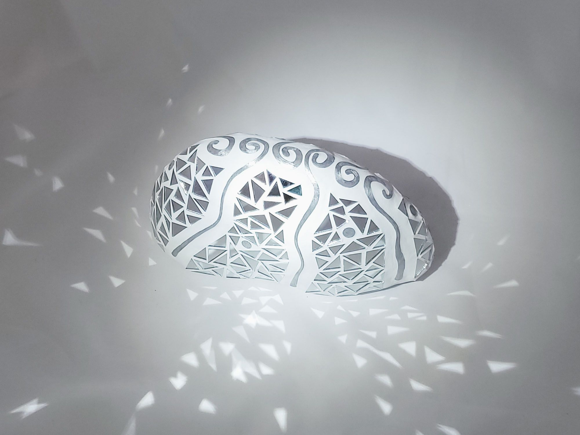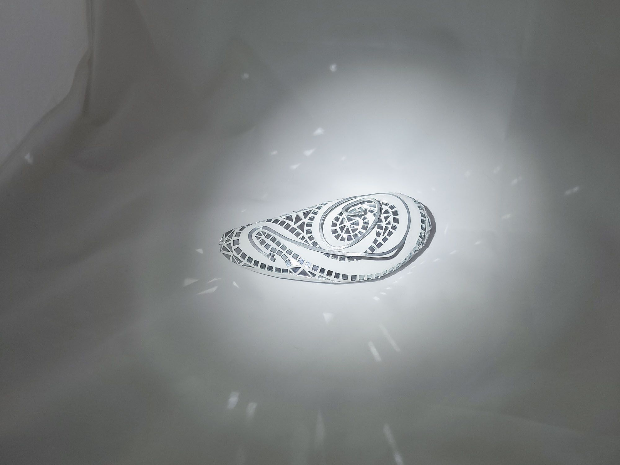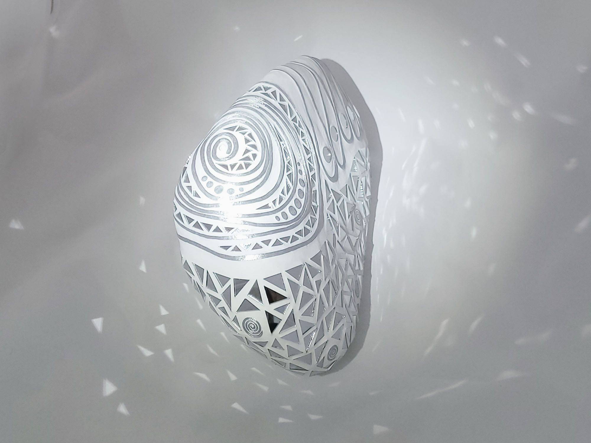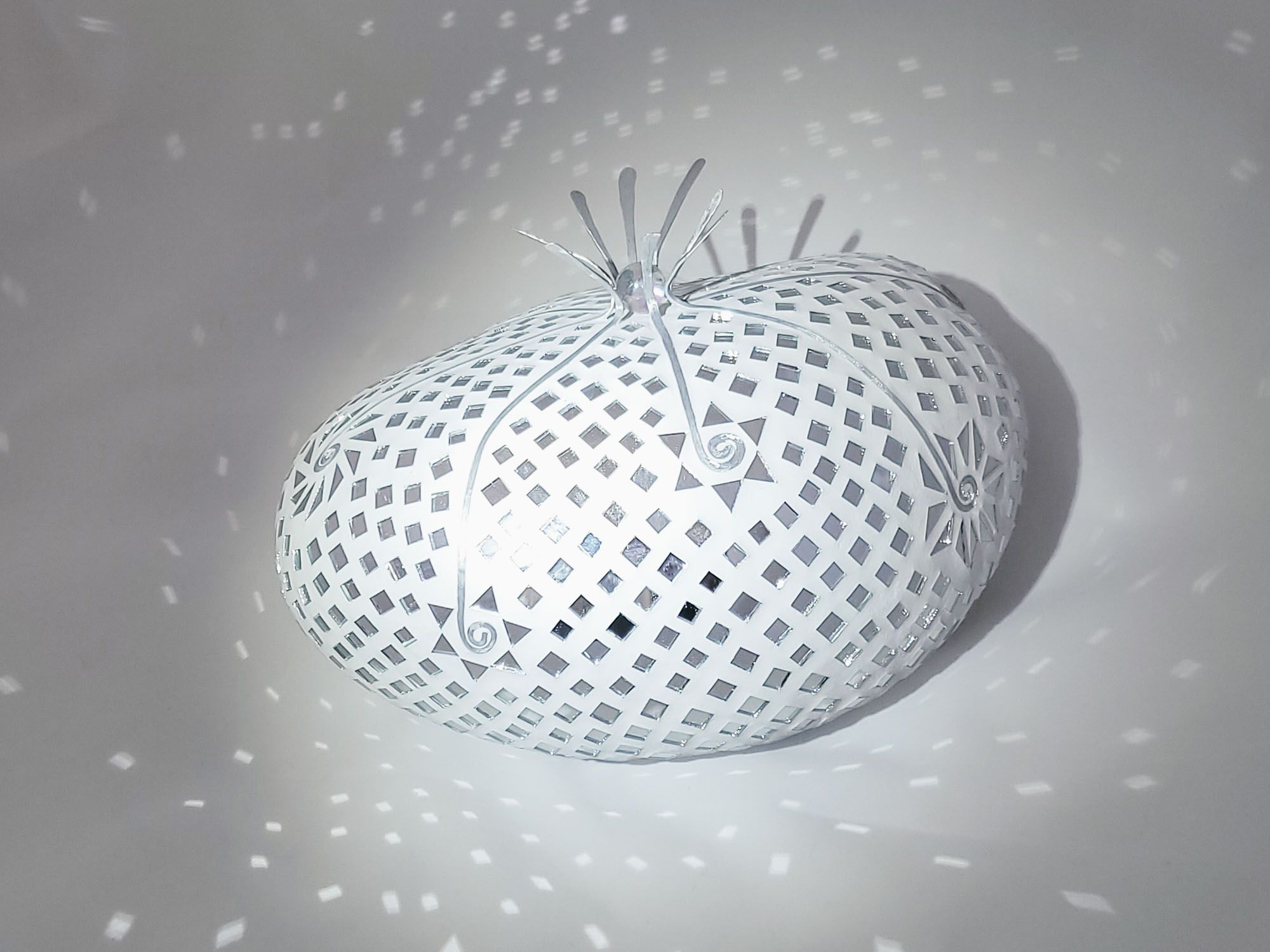 Die lichte Leichtigkeit der Steine: Für ihre Spiegelsteine verbindet ursamoh gegensätzliche Materialien und verarbeitet sie zu einem dreidimensionalen, glitzernden Ganzen. Basis für ihre harmonischen Werke sind bis zu 20 Kilo schwere Steine. Diese findet sie am Ufer oder im Wasser von Flüssen und Bächen. Die Steine überzieht sie in akribischer Kleinarbeit mit plattgeklopftem, geschwungenem Aluminiumdraht, Fugenzement und Glasnuggets. Damit verbunden ist ein ebenso intensiver wie spielerischer Dialog mit der Form und Dynamik jedes einzelnen Steins. Aus dieser Auseinandersetzung erschafft ursamoh lichterfüllte Unikate voller Energie.