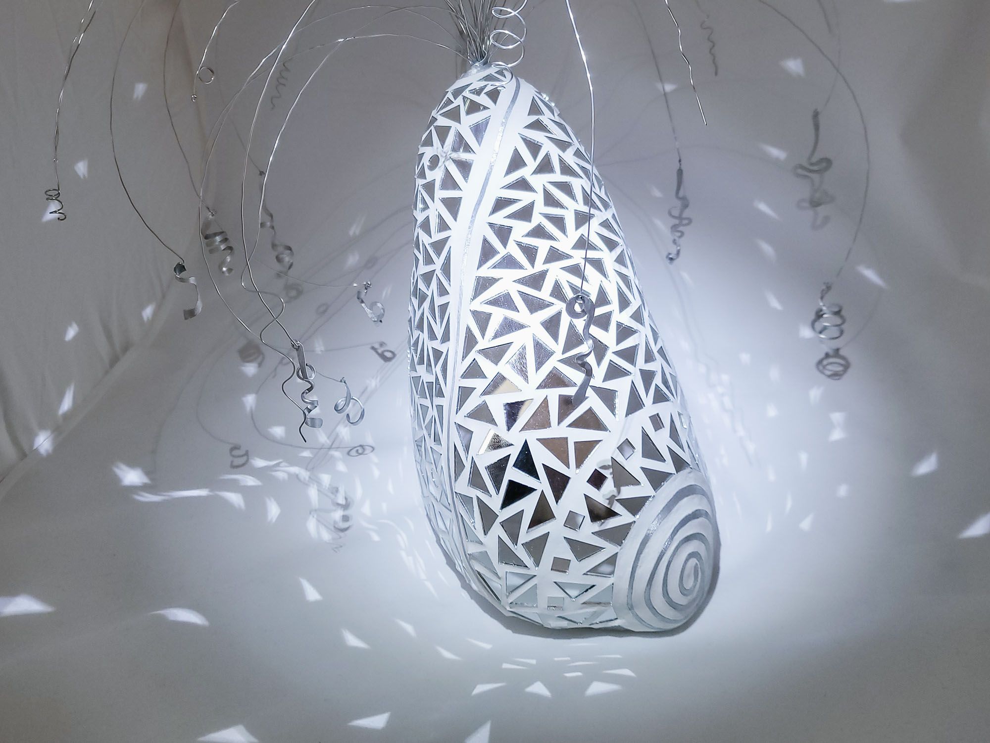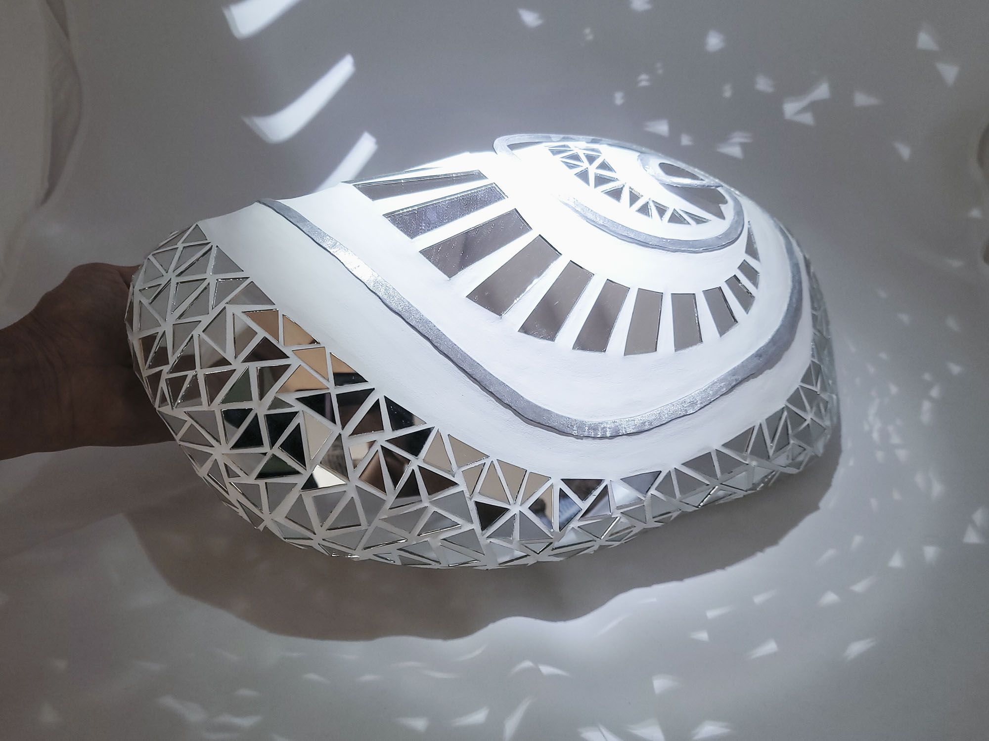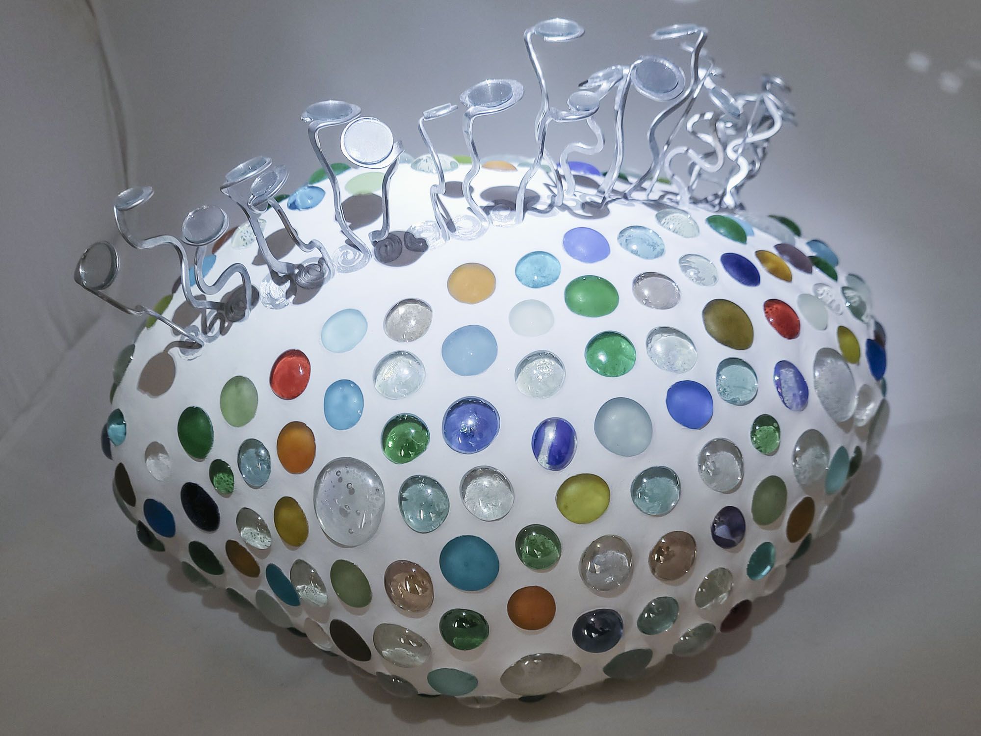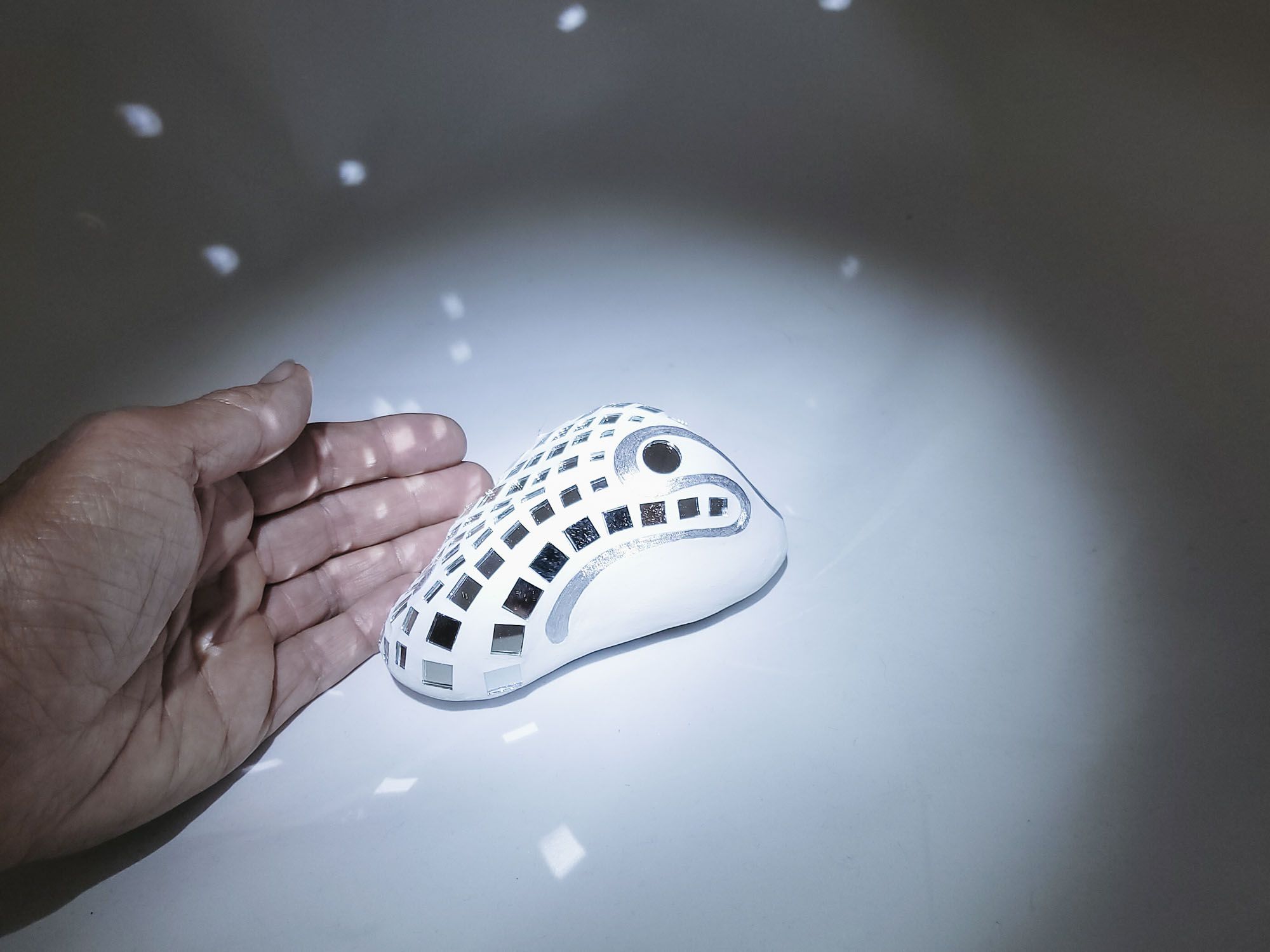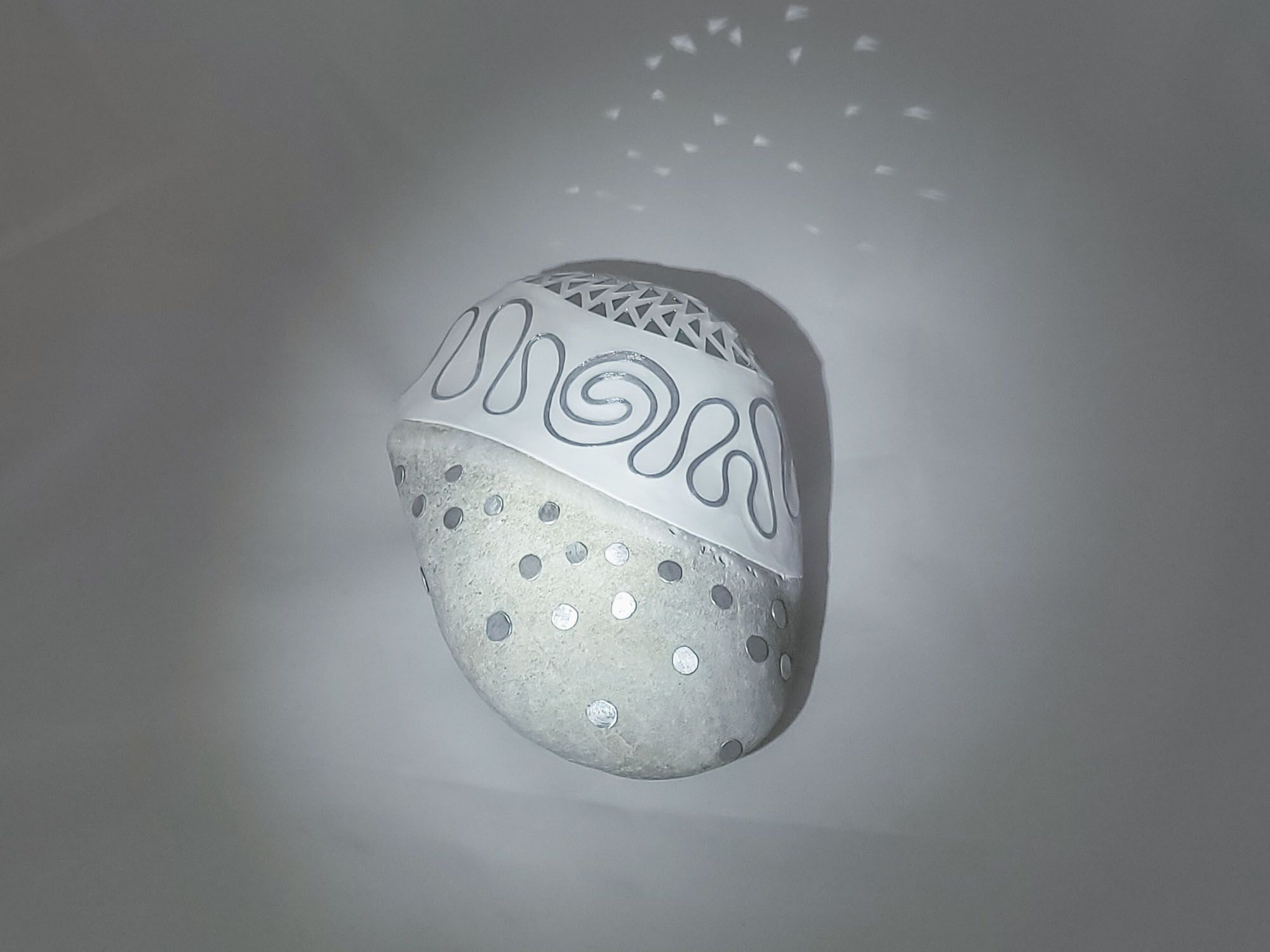 Die lichte Leichtigkeit der Steine: Für ihre Spiegelsteine verbindet ursamoh gegensätzliche Materialien und verarbeitet sie zu einem dreidimensionalen, glitzernden Ganzen. Basis für ihre harmonischen Werke sind bis zu 20 Kilo schwere Steine. Diese findet sie am Ufer oder im Wasser von Flüssen und Bächen. Die Steine überzieht sie in akribischer Kleinarbeit mit plattgeklopftem, geschwungenem Aluminiumdraht, Fugenzement und Glasnuggets. Damit verbunden ist ein ebenso intensiver wie spielerischer Dialog mit der Form und Dynamik jedes einzelnen Steins. Aus dieser Auseinandersetzung erschafft ursamoh lichterfüllte Unikate voller Energie.