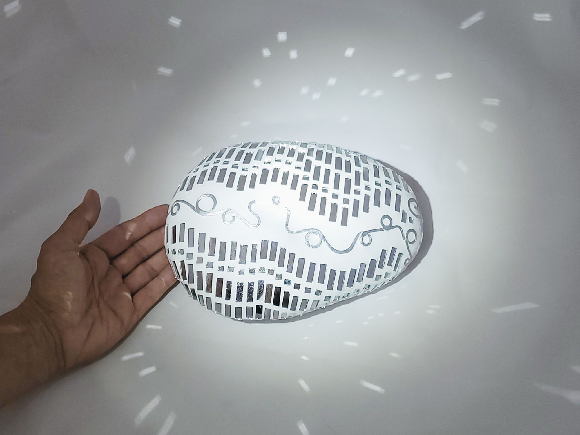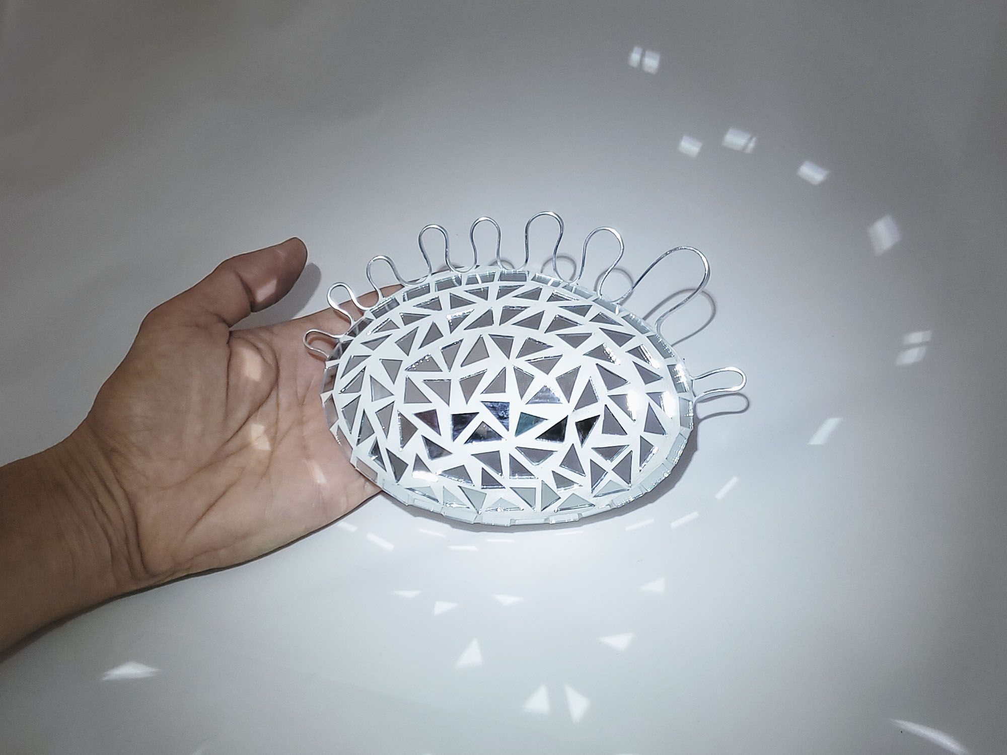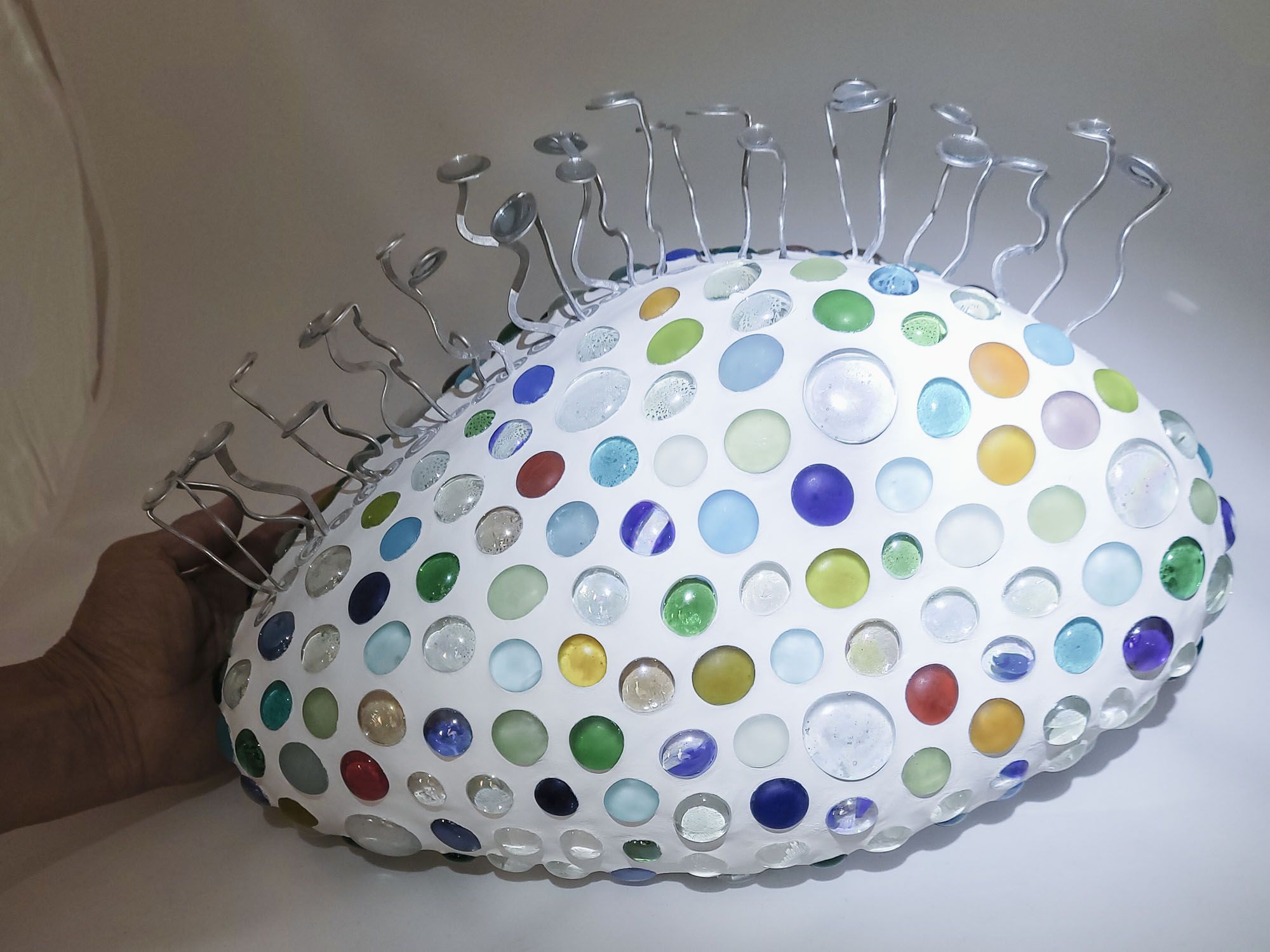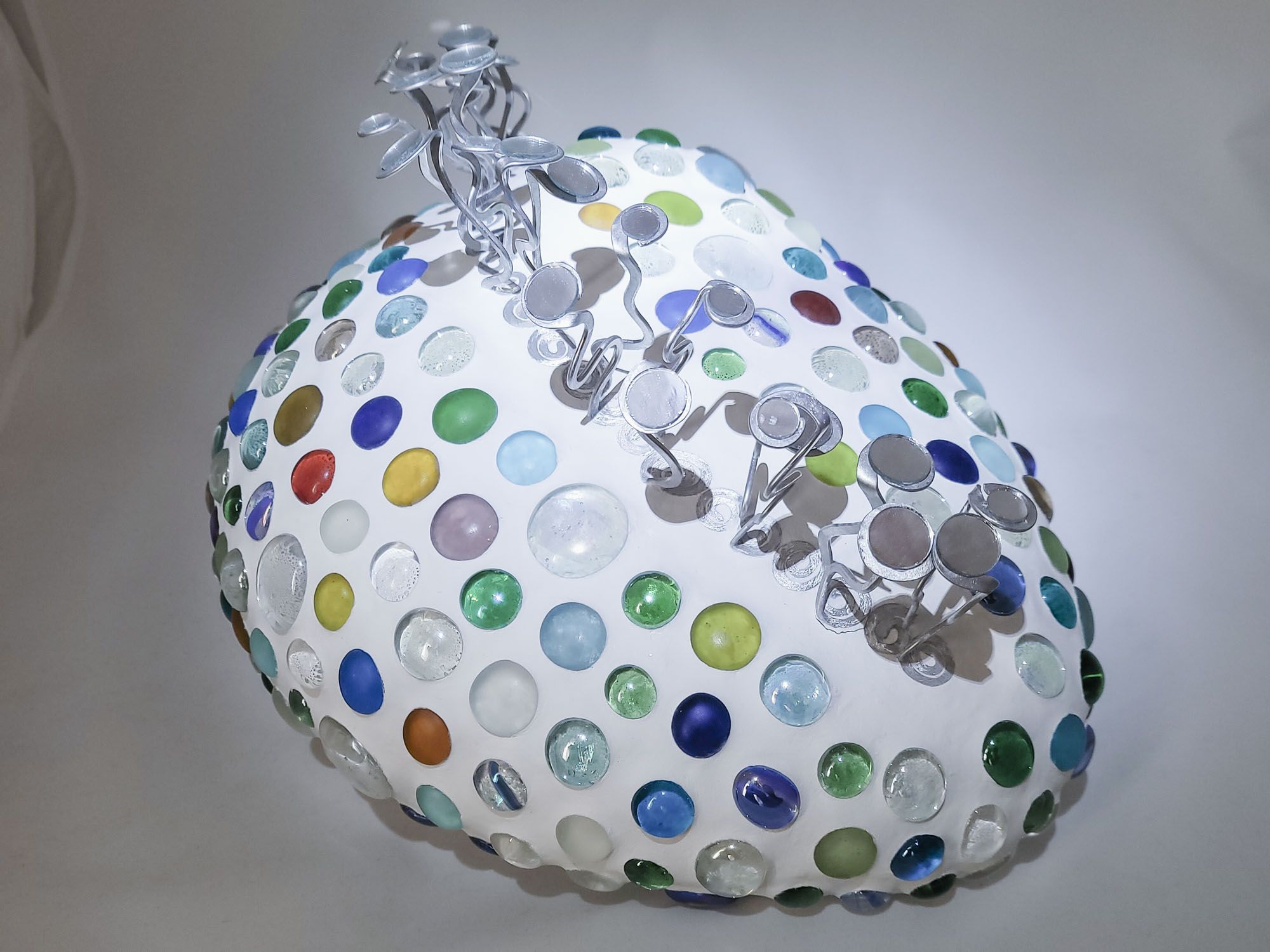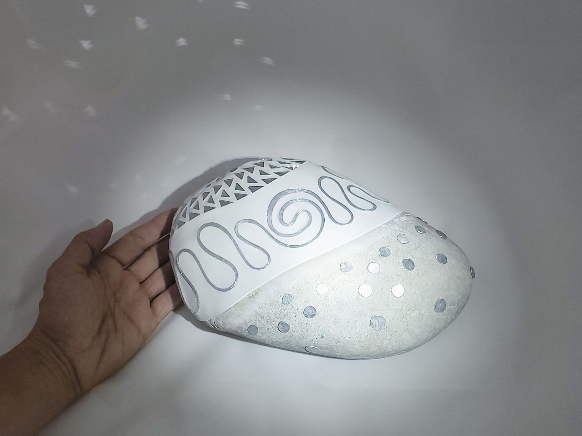 Die lichte Leichtigkeit der Steine: Für ihre Spiegelsteine verbindet ursamoh gegensätzliche Materialien und verarbeitet sie zu einem dreidimensionalen, glitzernden Ganzen. Basis für ihre harmonischen Werke sind bis zu 20 Kilo schwere Steine. Diese findet sie am Ufer oder im Wasser von Flüssen und Bächen. Die Steine überzieht sie in akribischer Kleinarbeit mit plattgeklopftem, geschwungenem Aluminiumdraht, Fugenzement und Glasnuggets. Damit verbunden ist ein ebenso intensiver wie spielerischer Dialog mit der Form und Dynamik jedes einzelnen Steins. Aus dieser Auseinandersetzung erschafft ursamoh lichterfüllte Unikate voller Energie.