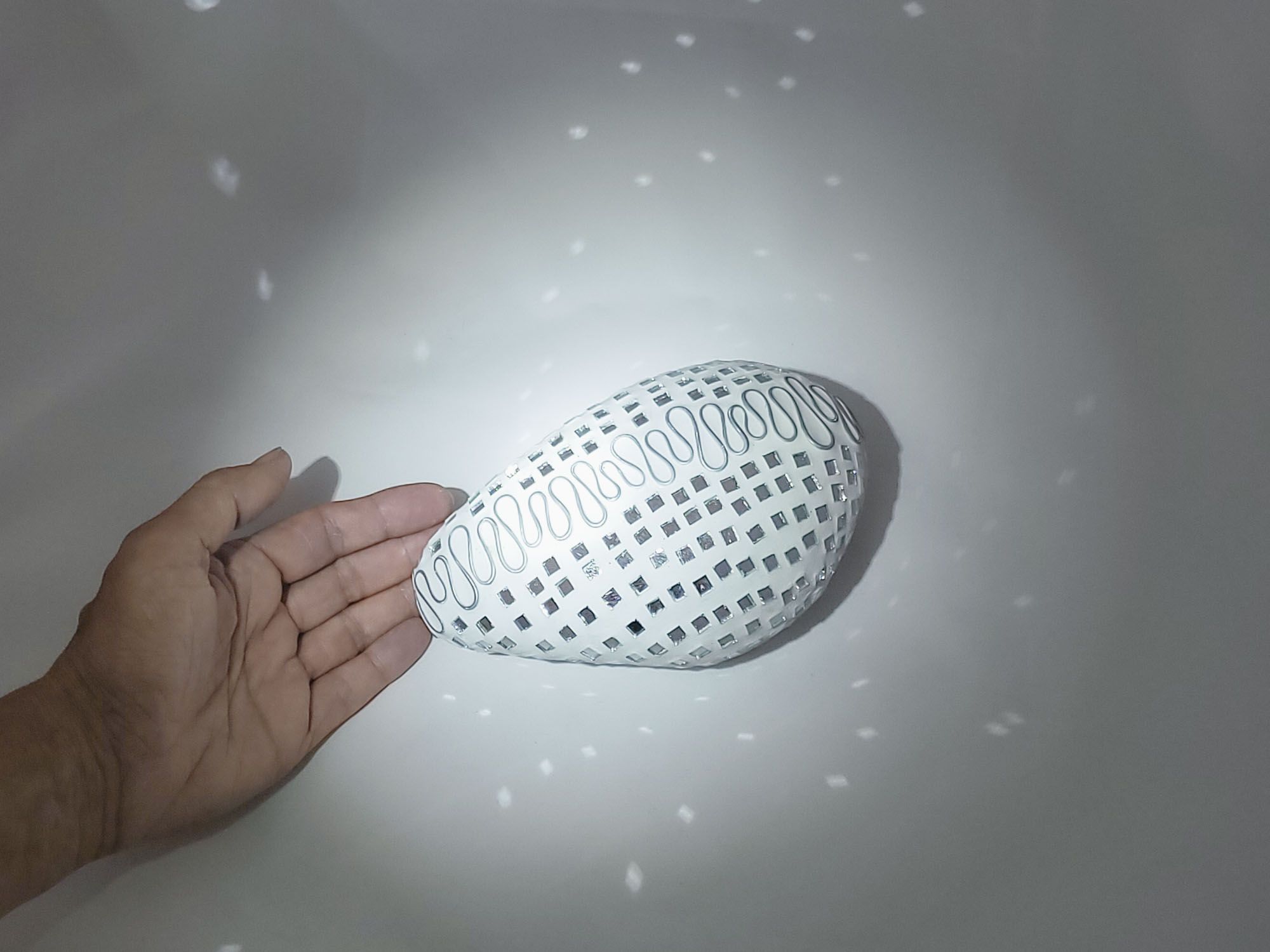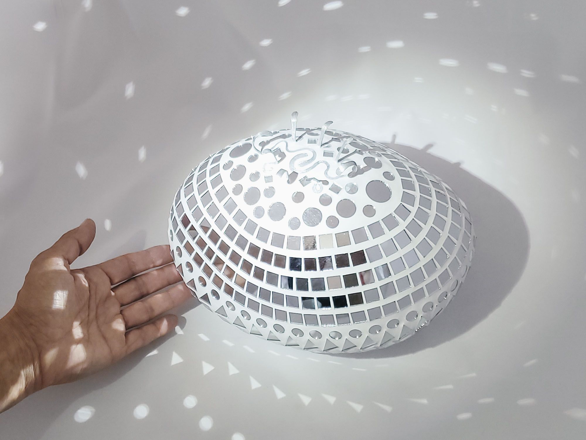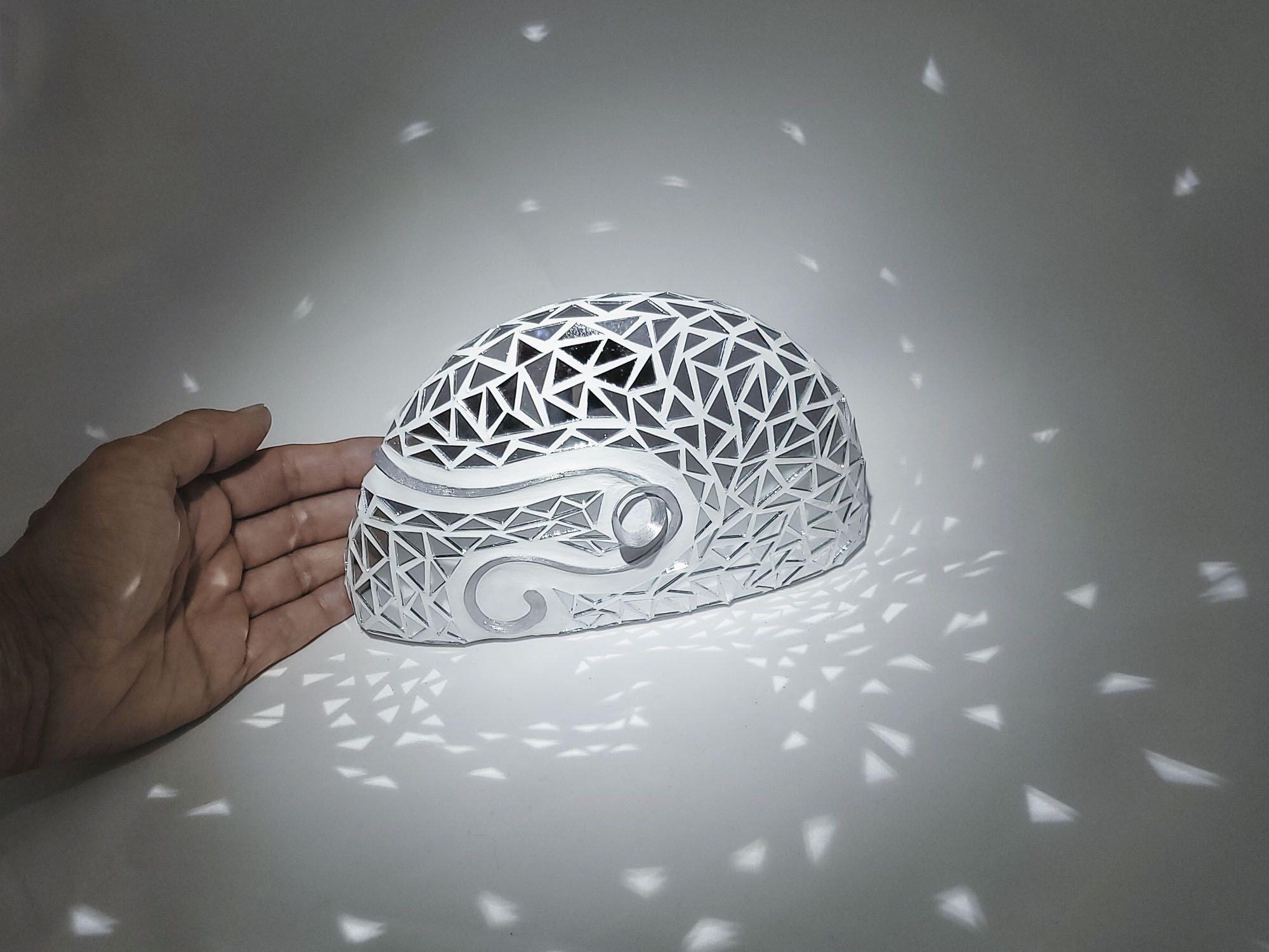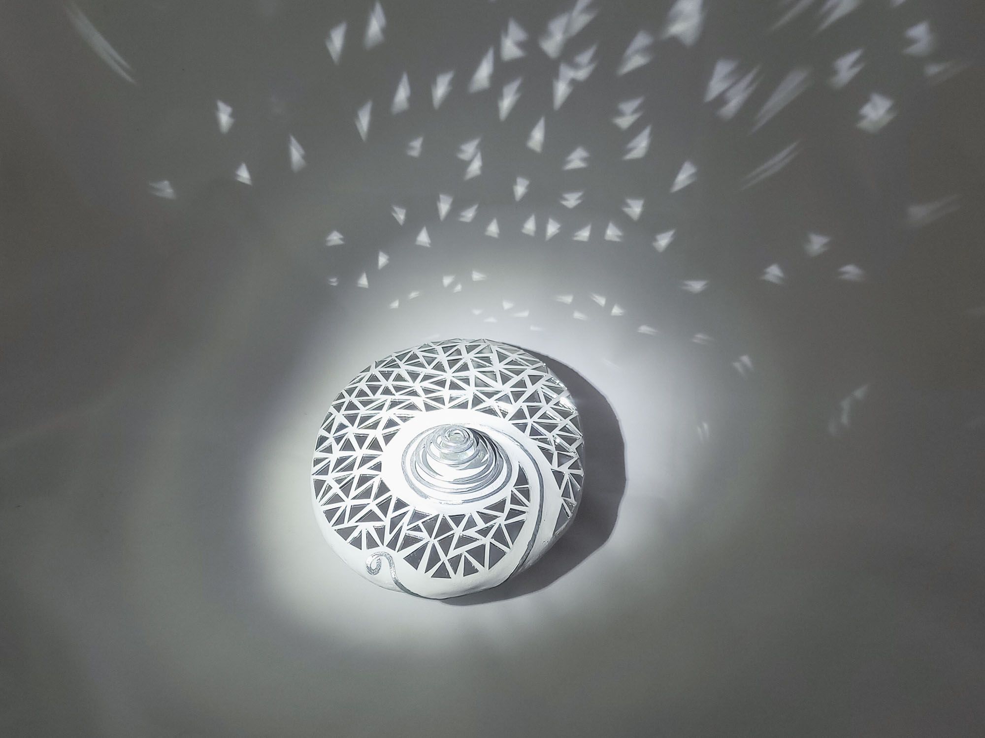 Die lichte Leichtigkeit der Steine: Für ihre Spiegelsteine verbindet ursamoh gegensätzliche Materialien und verarbeitet sie zu einem dreidimensionalen, glitzernden Ganzen. Basis für ihre harmonischen Werke sind bis zu 20 Kilo schwere Steine. Diese findet sie am Ufer oder im Wasser von Flüssen und Bächen. Die Steine überzieht sie in akribischer Kleinarbeit mit plattgeklopftem, geschwungenem Aluminiumdraht, Fugenzement und Glasnuggets. Damit verbunden ist ein ebenso intensiver wie spielerischer Dialog mit der Form und Dynamik jedes einzelnen Steins. Aus dieser Auseinandersetzung erschafft ursamoh lichterfüllte Unikate voller Energie.